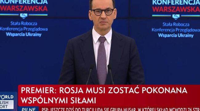 Morawiecki przypominał, że Polska jako pierwsza stanęła po stronie Ukrainy i jako pierwsza pokazała, że to nie jest wojna tylko z Ukrainą, ale że jest to wojna o przyszłość Europy i całego wolnego świata.